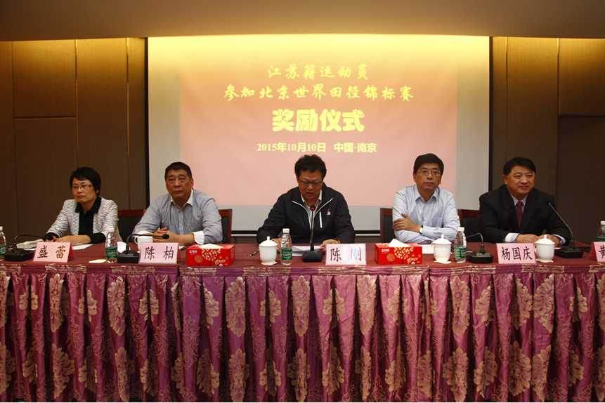 “江蘇鐵人田徑隊運(yùn)動員參加北京田徑世錦賽獎勵儀式” 在省體育局訓(xùn)練中心隆重舉行